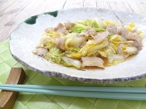 3.フライパンにごま油をを中火で熱し、豚肉を焼く直前に片栗粉をまぶして焼き、色が変わったら白菜の芯を炒めます。