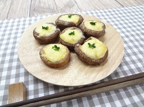 3.しいたけのかさの内側に「2」をぬり、チーズをのせてオーブントースターで焼きます。