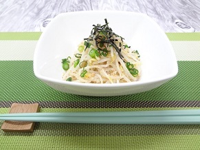 1.もやしは、塩とごま油を加えた熱湯で約1分半茹でてザルにあげ、しっかりと水気を切ります。