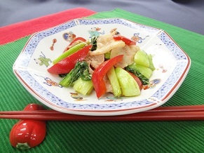 4.フライパンにゴマ油を中火で熱し、豚肉を炒めて色が変わったら、チンゲンサイの軸を入れ、火が通ったらチンゲンサイの葉とパプリカを加えて、全体を炒めます。
