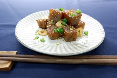 1.こんにゃくは、表面に格子状に深さ3~5㎜ほど切り込みを入れ、鍋に熱湯を沸かして、3~4分茹でてアク抜きをします。