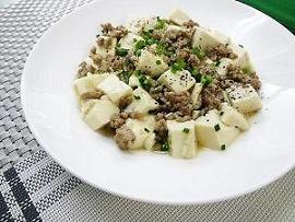 3.ひき肉を入れて色が変わったら〈調味料〉を加えて中火~強火で加熱し、豆腐を加えて全体を混ぜ合わせます。