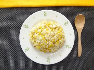 4.卵が半熟状になったらごはんを加え、全体をほぐし炒め、とうもろこしと〈調味料〉を加えて混ぜ合わせます。