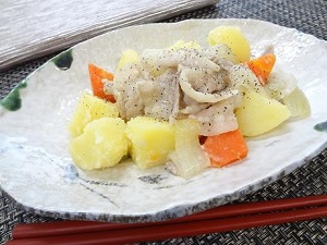 5.豚肉の色が変わったら、じゃがいも・にんじん・玉ねぎを入れ、全体に油が回ったら水と塩麹を加えます。