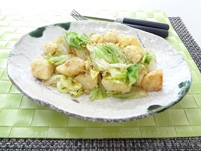 5.フライパンにバターを中火で熱し、じゃがいもとキャベツを炒めて、適度な焼き色がついたら塩麹と黒胡椒を加え、全体を混ぜ合わせたら火を止めます。