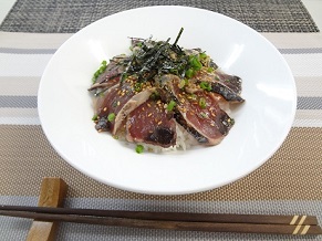 1.カツオは食べやすい大きさに切ります。