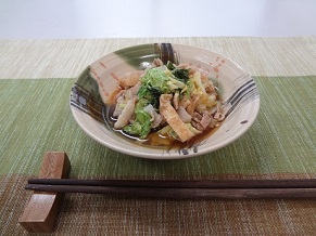3.油揚げは熱湯をまわしかけて油抜きをし、1cm幅の短冊切りにします。